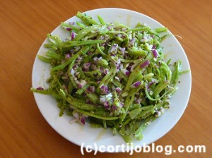 Cook the beans in boiling water for 3 minutes and drain. Mix with onion, squeeze of lemon juice, mustard, chilli powder, olive oil and season with salt and pepper.