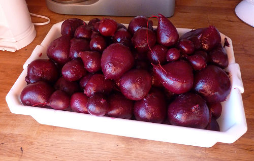 To prepare the beetroot, put into a pan and cover with water. Bring to the boil and then turn down the heat and simmer for 45 minutes. Leave to cool and then skin by squeezing in your hands. Your hands will turn red but it doesn’t take long for them to go back to their normal colour.
