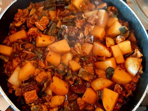 - 2 cups dried courgettes, put into boiling water to soak in the morning