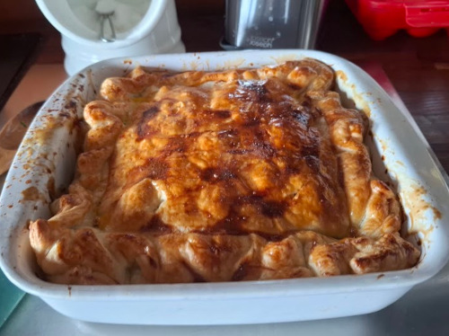 - Unroll the flaky pastry and drape it over the pie dish. Trim the edges, press down with a fork to seal, and cut a small slit in the center for steam.
