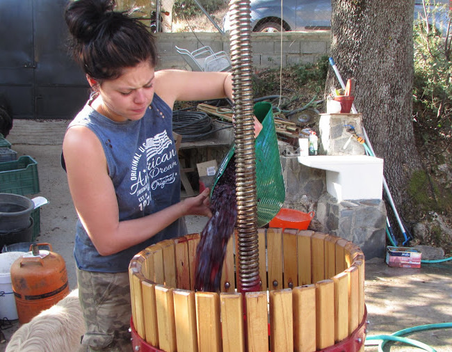 The grapes have been de stemmed and crushed up in the machine. Heather adds them to the wine press.