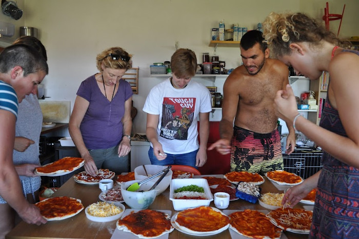 We often making pizzas in the wood fired pizza oven. Everyone chooses their own topping and then we put the pizzas in the oven.