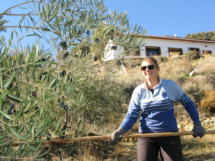 Bashing olives off a tree with a stick