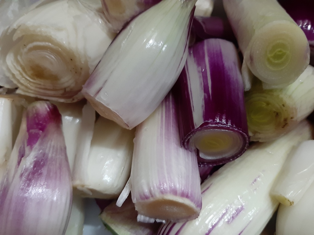 On Tuesday 16th March, I harvested the remaining onions and prepared them for the freezer or fridge. There were white and red onions, of all different shapes and sizes. I thinly sliced some and used them for these onion bhajis.
